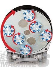 The Scan Combiflex 1000RC (SC-1000RC) is the largest model in our line of grinding machines. It is a robust and very stable machine, made entirely of steel and designed for large commercial applications. The SC-1000RC has six grinding discs, which rotate on a large drum that turns in the opposite direction. With the unique positions of the six grinding heads, it’s also possible to operate the machine in a four-disc configuration. This allows the machine to grind with increased head pressure, and is very useful for certain applications.